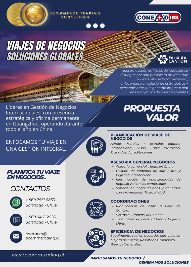 Este nuevo paso estratégico nos permite ofrecer un servicio más integral, con pilares sólidos y profesional, cubriendo cada etapa del proceso de comercio internacional. Desde Chile, gestionamos viajes de negocios personalizados, la búsqueda de proveedores confiables, así como la importación y exportación de productos entre China y Chile.