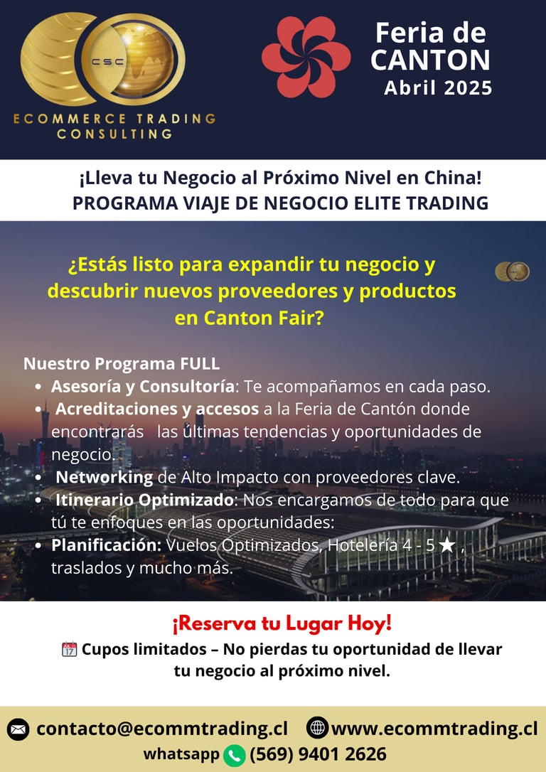 El programa "Elite Trading" de Ecommerce Trading & Consulting está diseñado para empresarios y emprendedores que buscan aprovechar oportunidades comerciales en China, con un enfoque particular en la Feria de Cantón. Este programa ofrece una experiencia integral de viajes de negocios, facilitando el acceso a contactos clave, estrategias de negociación y apoyo en la transformación digital, para optimizar la importación y exportación de productos.